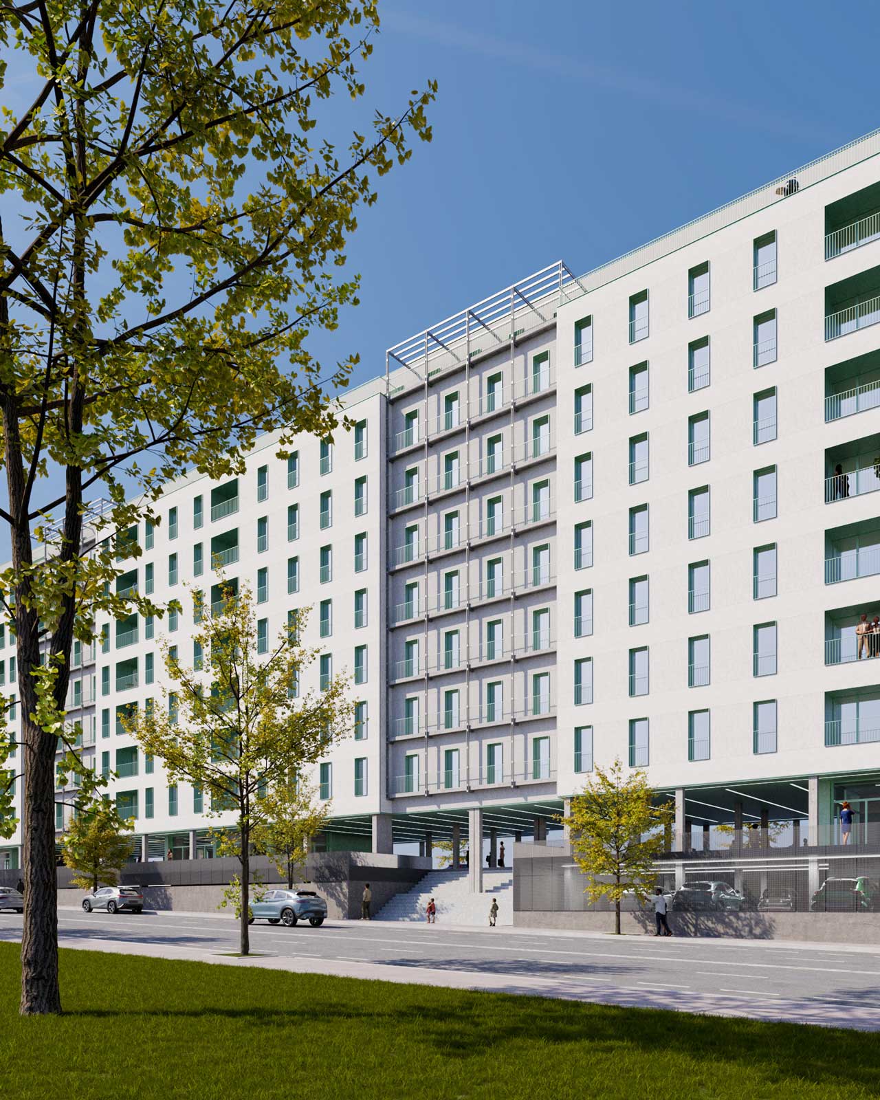 Volumetrically, the project presents a modern, serene, and orderly aesthetic. It is articulated in four large symmetrical blocks, a composition that breaks the monotony of a single, massive façade. This division is accentuated by three “fissures” or set-back volumes that not only house the communication cores for each entrance but also visually lighten the complex and give it a vertical rhythm.