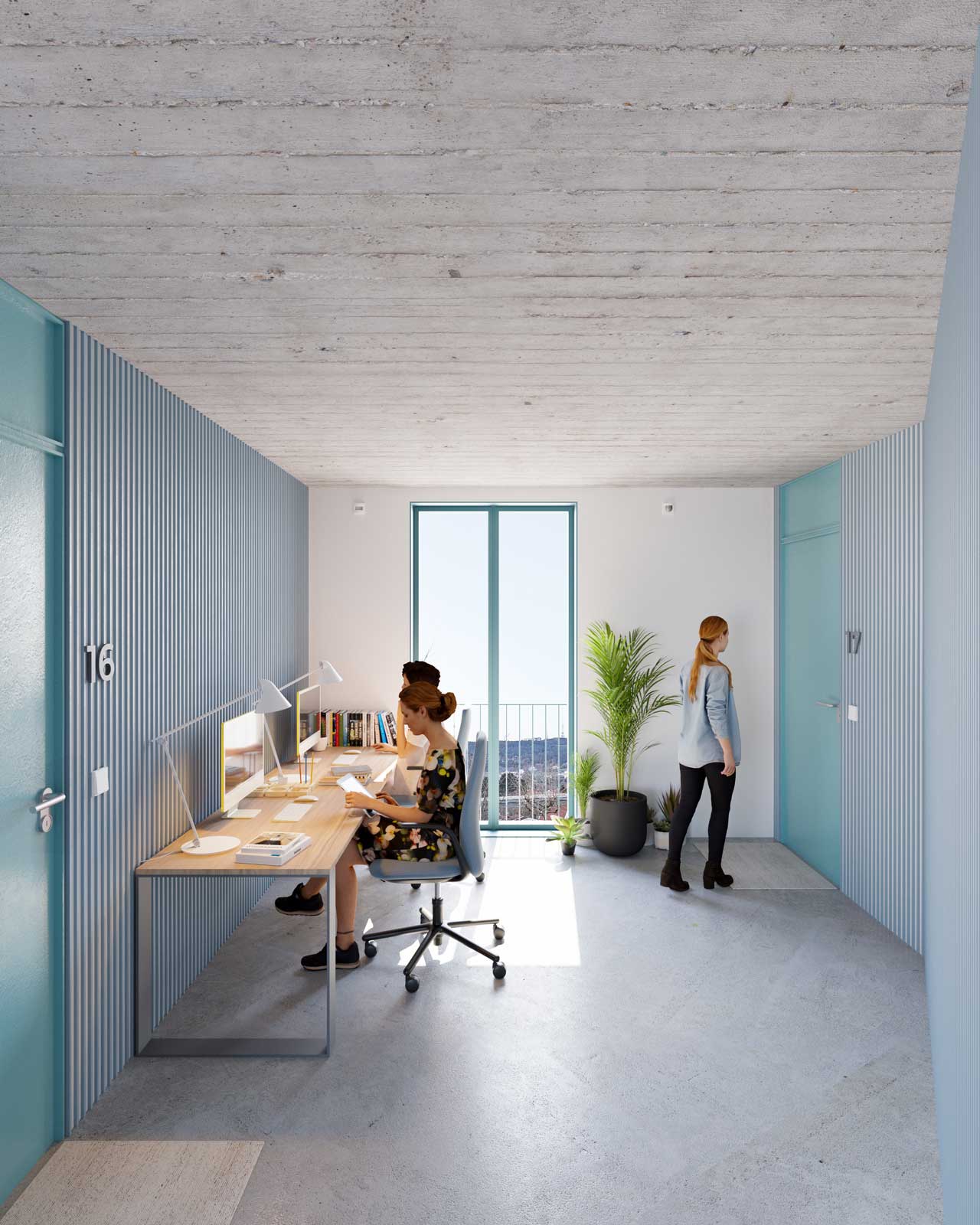 This community vocation extends vertically. The upper floors include centralized laundry and natural drying areas, while the fifth floor crowns the building with a flexible-use space exclusively for residents, equipped with a kitchen and living area, designed for gatherings and group activities.