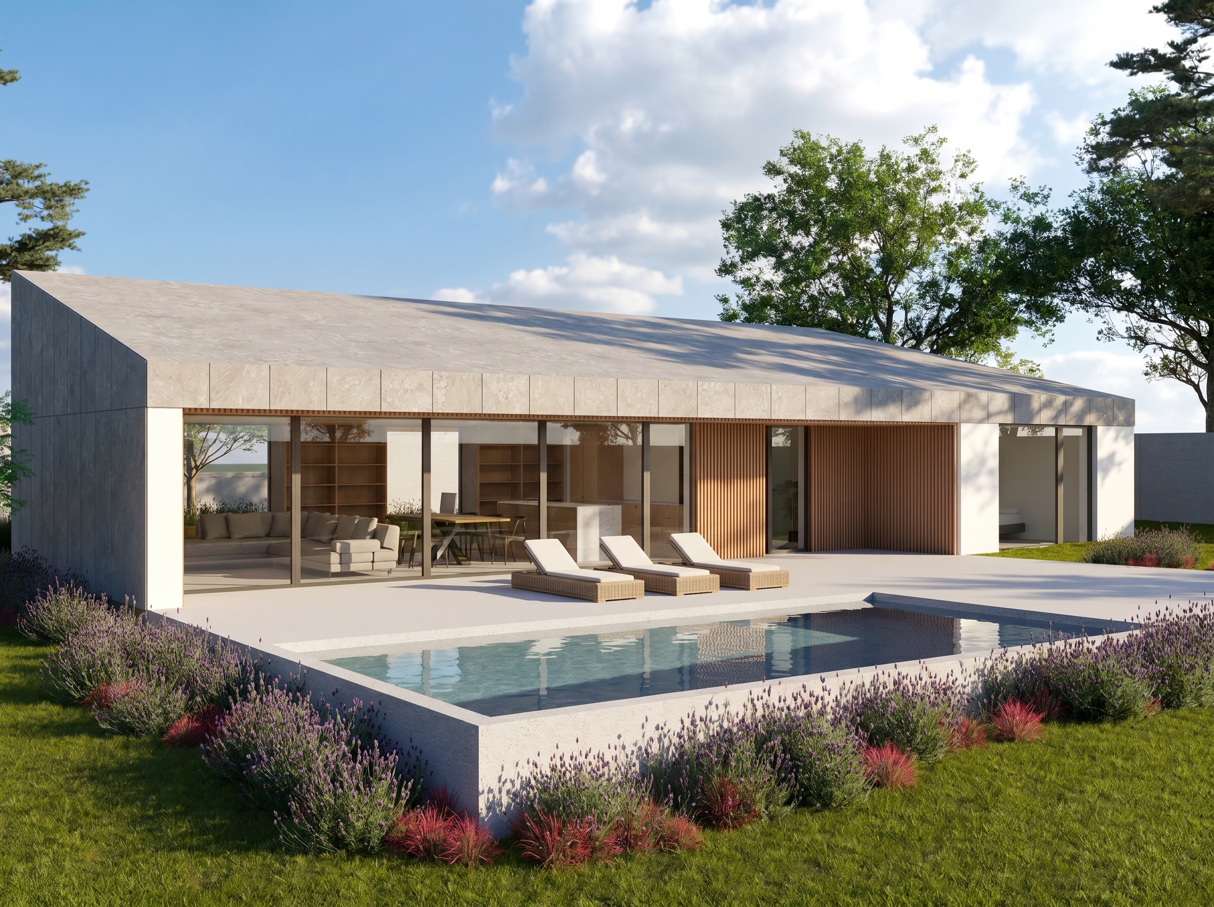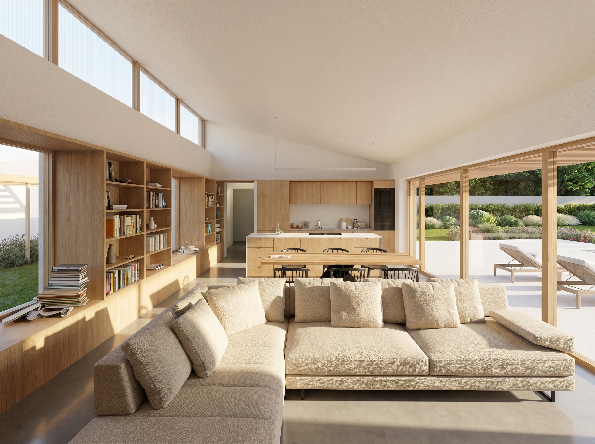 Esta configuración permite que a á social e a á privada converxan nun ángulo que abraza a piscina e o xardín, creando un microclima protexido. A arquitectura aquí actúa como un filtro, onde a fachada exterior se mostra sólida e segura, mentres que a interior se desvanece mediante grandes panos de vidro que eliminan visualmente os límites entre o salón e o céspede.