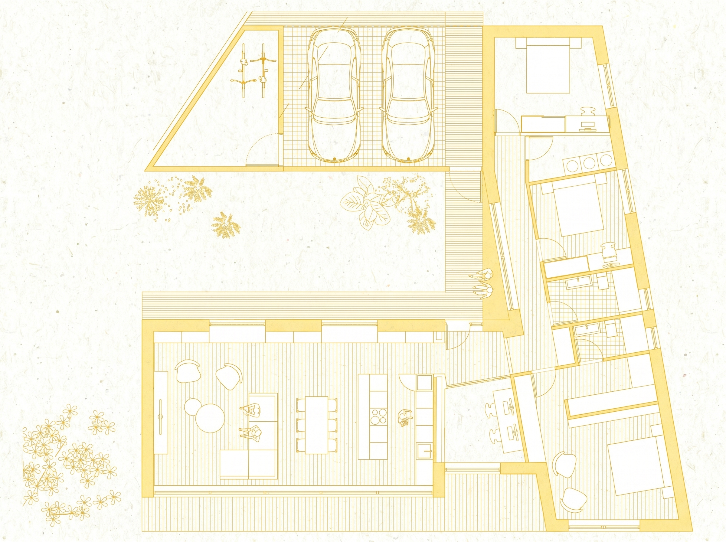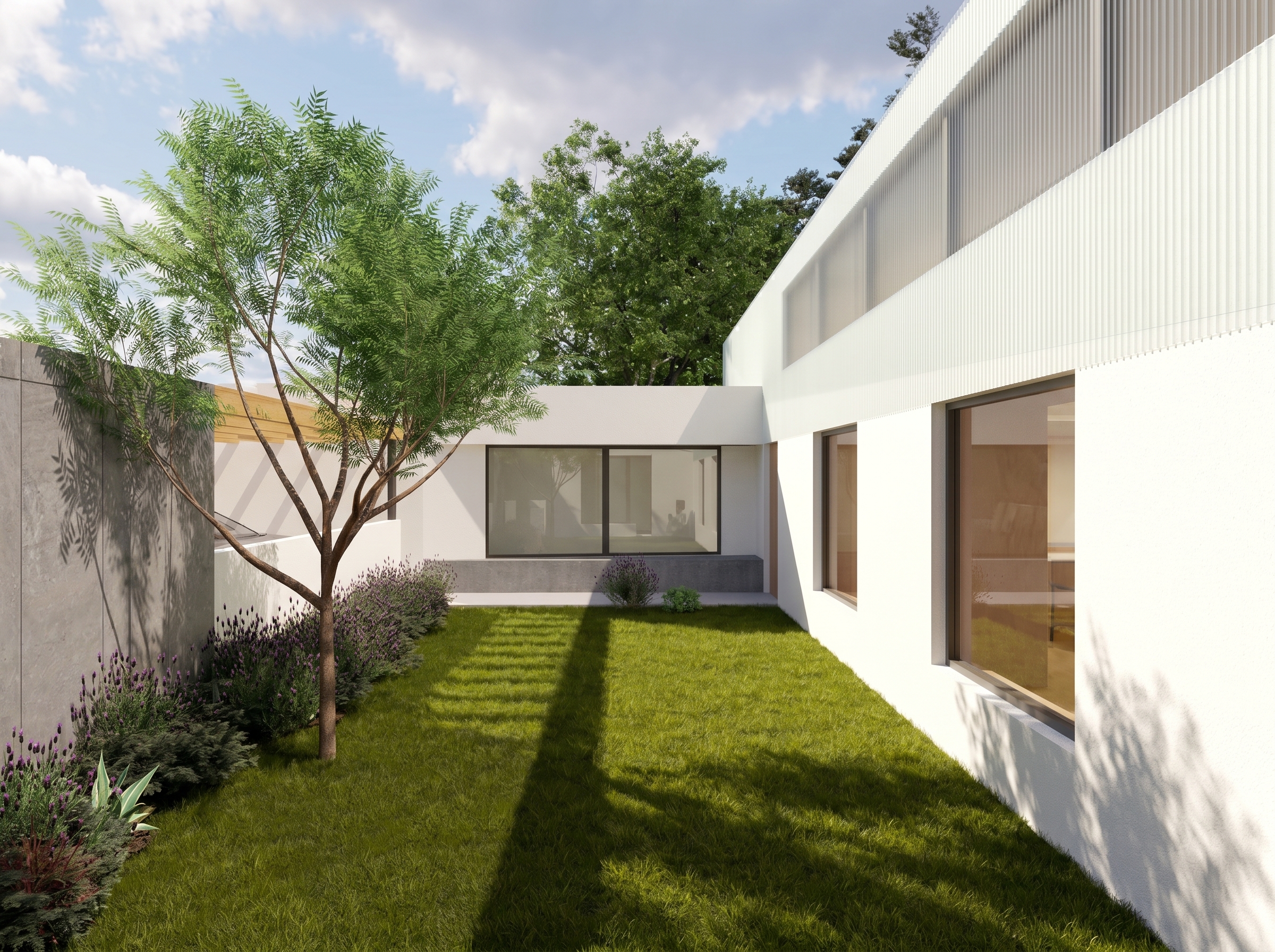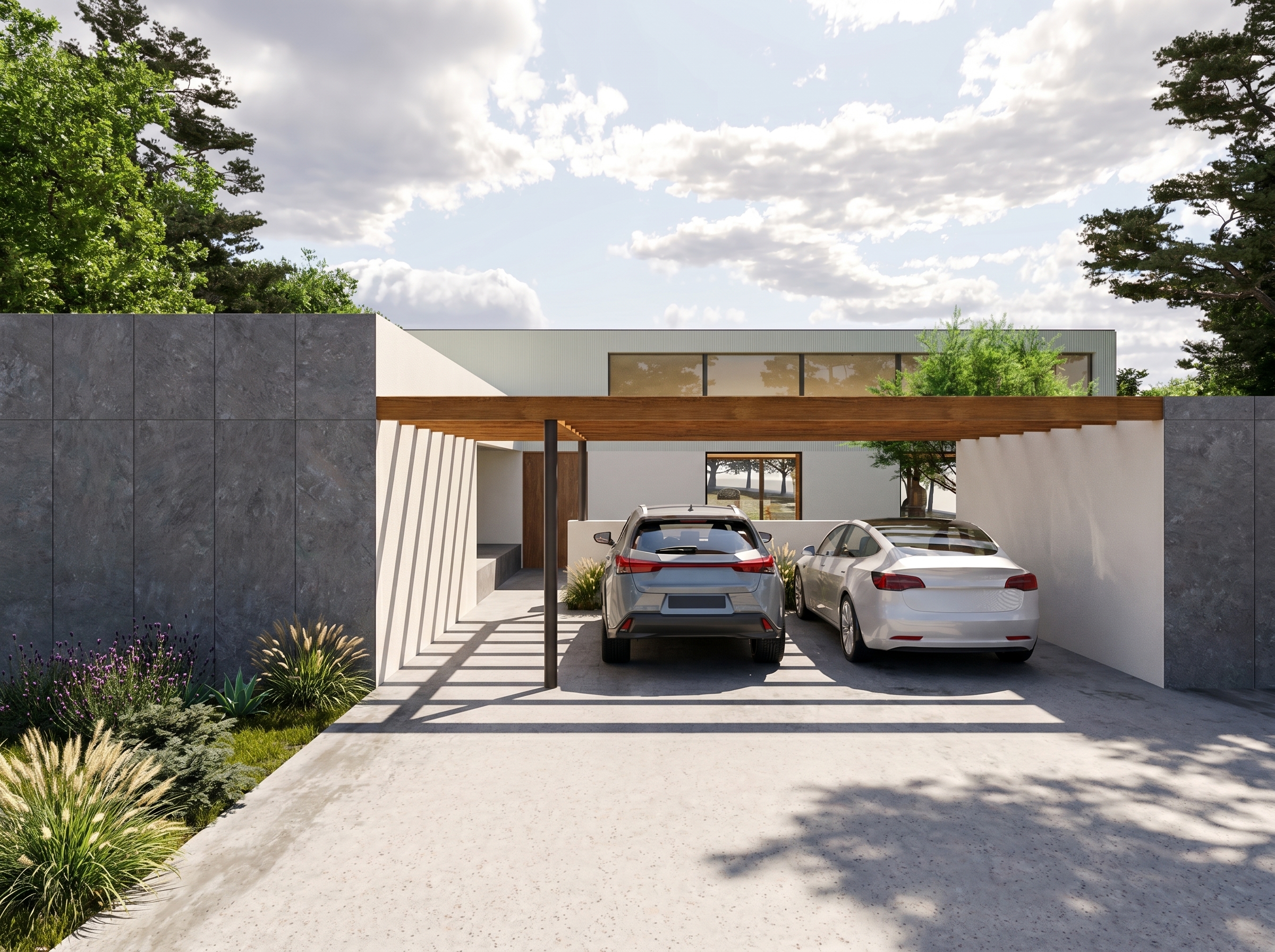 O deseño da Vivenda EL52 xorde dunha análise profunda do terreo e a súa orientación. A decisión de organizar o programa en forma de “L” responde a unha dobre intención: protexer o espazo doméstico das miradas externas e envorcar toda a vida da casa cara a un núcleo central axardinado.